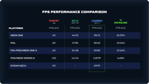 One of our less discussed changes was improving performance. Here is an overview of the FPS increases! (PC had major gains too, but we don't know your specs, so let us know what you see tomorrow!)